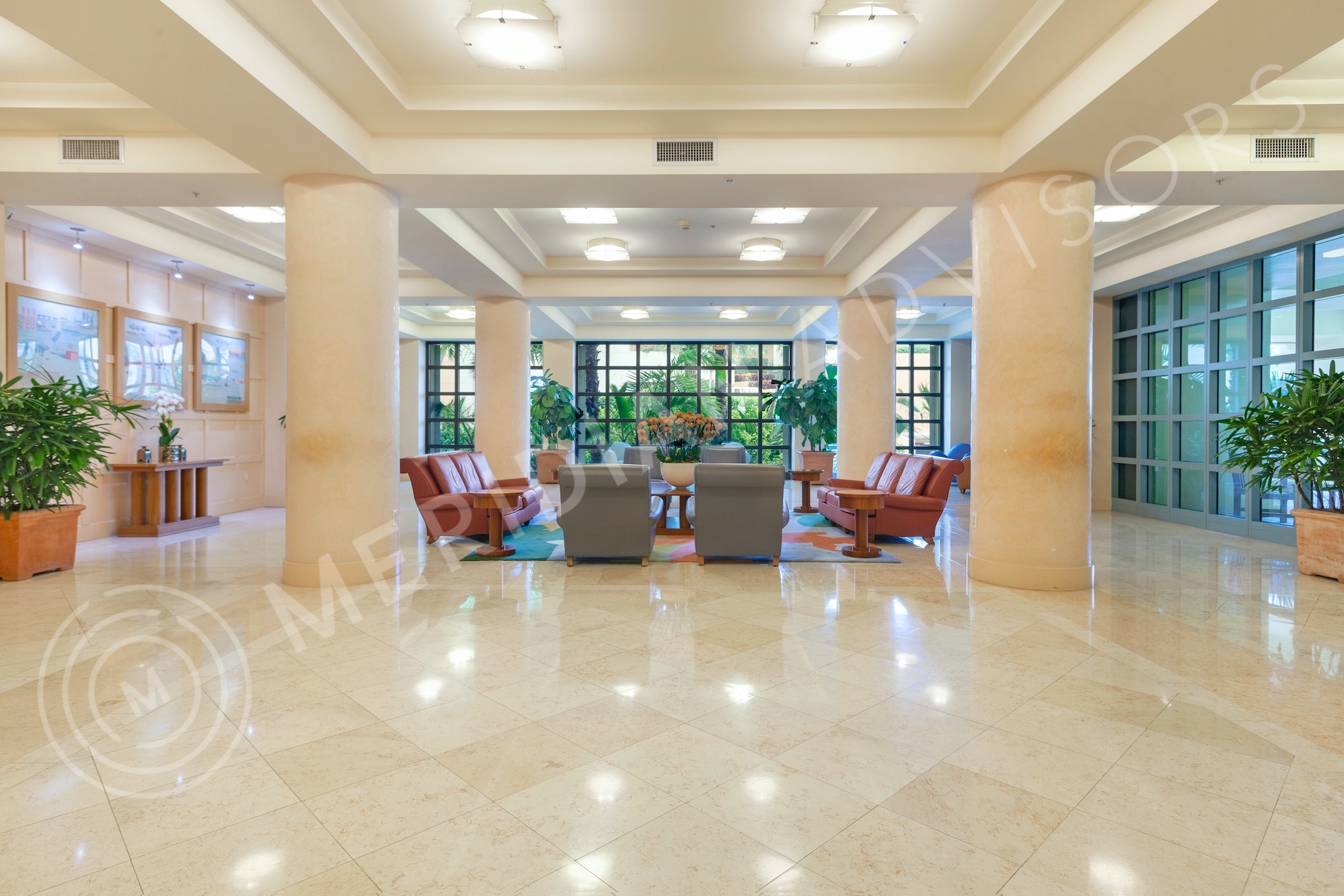 Graves’ highly recognizable postmodernist aesthetic can be seen throughout the 16-story, 112-unit condo. There’s the cylindrical turquoise tower on the ocean-side with a funky roofline that could be interpreted as castle crenulations, a crown, or old-world industrial smokestacks. Meanwhile, the glass-enclosed lobby has thick, grid-like mullions blanketing the interior walls,, surrounding clusters of monumentally overstuffed club chairs. Architectural and design details come together to create a comprehensive whole, strong enough that Graves himself chose the building as his vacation residence, visiting frequently for many years before his death.